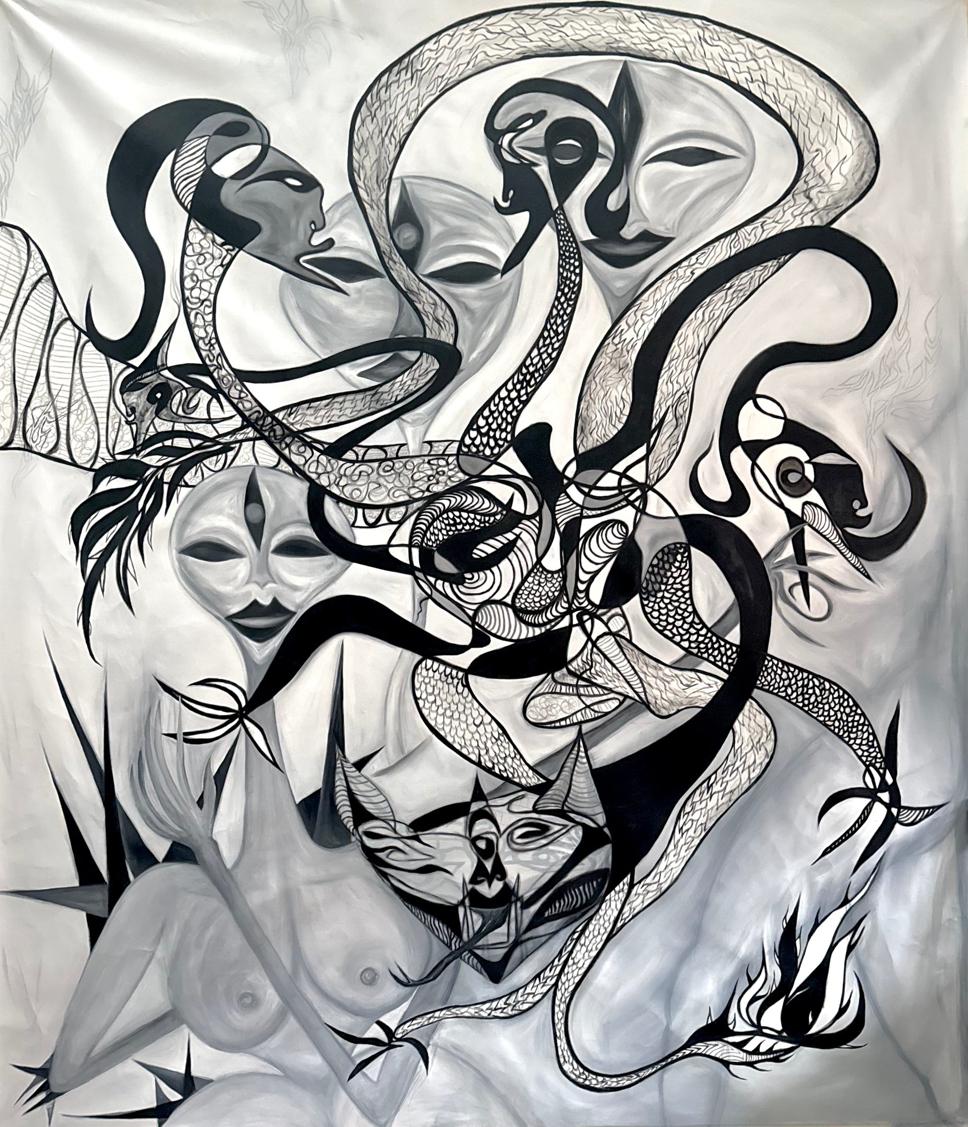 EXCURSIONIST was born out of refusal — a conscious decision to strip away color and confront the structure of my work without distraction. As my only large-scale painting executed entirely in black and white, it challenged my instinct to intensify and expand through chromatic force.